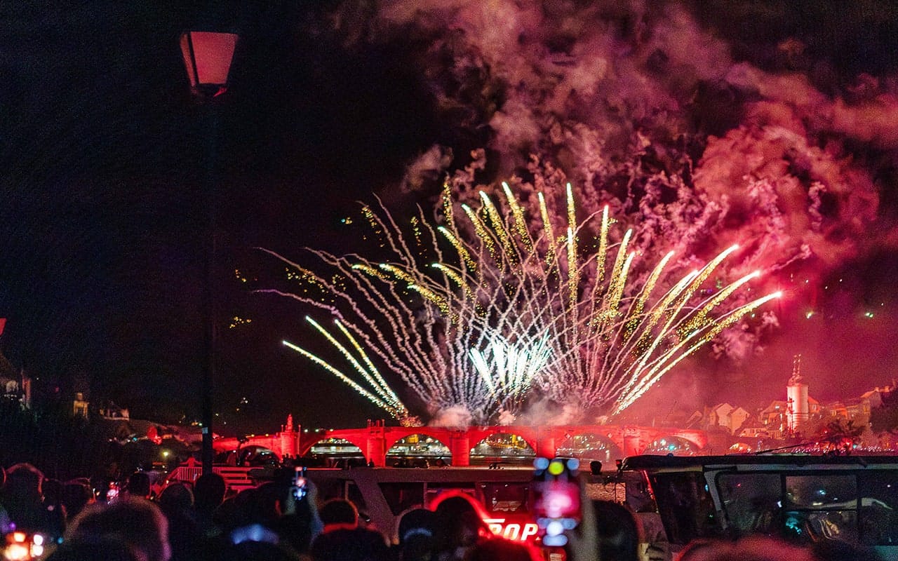 Heute gegen 22.15 Uhr tauchen Bengalische Leuchtfeuer das Heidelberger Schloss langsam in einen geheimnisvollen roten Feuerschein. So, als ob die Ruine ein weiteres Mal in