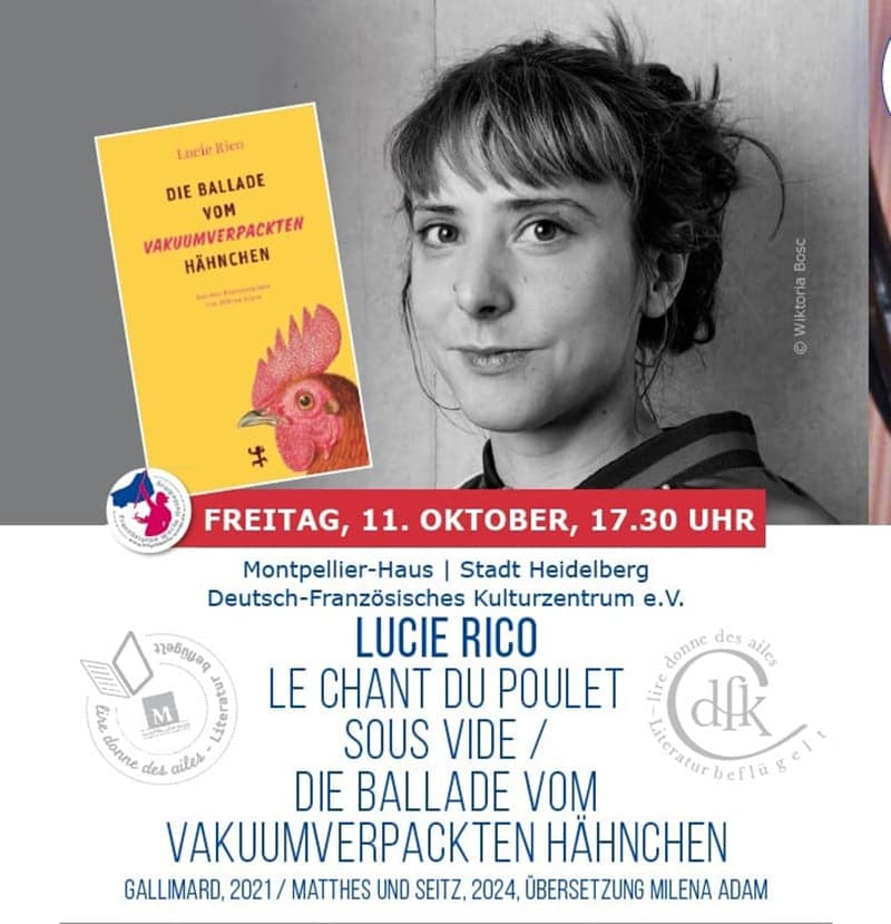 Lucie Rico (*1988) kommt als erste Autorin zu einem Residenzprogramm nach Heidelberg, das von Occitanie Livre et Culture, dem Montpellier-Haus und der Stadt Heidelberg initiiert wurde. Zum Abschluss wird sie über ihren Debütroman Die Ballade vom vakuumverpackten Hähnchen sprechen, der mit dem Prix du Roman d’Écologie ausgezeichnet wurde. Auf ironische und bizarre Weise setzt sich Rico darin mit dem Verhältnis des Menschen zu seiner tierischen Umwelt auseinander. Aus der Perspektive von Hannah wird die Geschichte einer jungen Frau erzählt, die nach dem Tod ihrer Mutter auf deren Hühnerhof zurückkehrt – vorübergehend, denkt sie. Doch das Landleben nimmt sie in Beschlag: Sie schlachtet, vakuumiert und verabschiedet dabei jedes Hähnchen mit einer eigenen Biografie, die der Verpackung beiliegt. Aus dieser Geste der Wertschätzung entsteht ein Marketingprojekt, das irrwitzige Ausmaße annimmt.