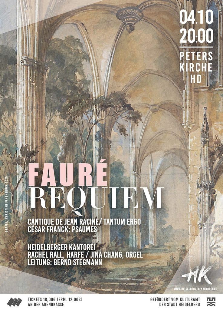 Seien Sie eingeladen zu einem herbstlichen Spaziergang durch die musikalischen Gefilde der französischen Romantik. Im Zentrum des Konzertes der Heidelberger Kantorei steht das wegen seiner unvergleichlich sanften Tönung überaus geschätzte Requiem von Gabriel Fauré – hier in einer Fassung für Chor, Soli, Orgel und Harfe.