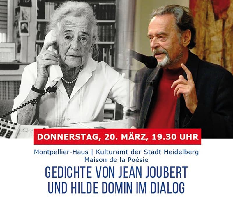 Im Vorfeld des Welttags der Poesie am 21. März werden sie von ihren Erfahrungen und Herausforderungen bei der Übersetzung der Gedichte von Jean Joubert und Hilde Domin berichten. Hilde Domin ist in Heidelberg bestens bekannt; Jean Joubert war ein Dichter und Romanautor aus Montpellier, 1975 Preisträger des Prix Renaudot für seinen Roman L’homme de sable. Er war 2005 Gast bei den Heidelberger Literaturtagen.