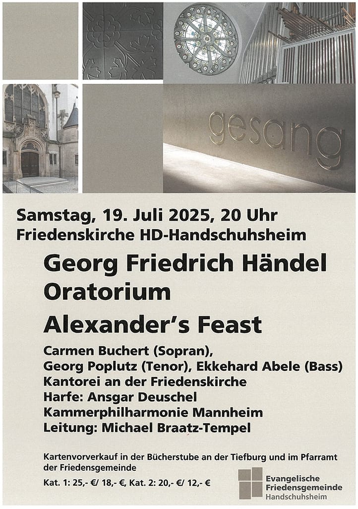 Am Samstag, 19. Juli findet um 20 Uhr in der Friedenskirche in Heidelberg-Handschuhsheim das große Sommerkonzert der Kantorei statt. Es erklingt festliche barocke Musik von Georg Friedrich Händel. Sein selten zu hörendes Oratorium Alexander’s Feast sowie das zugehörige Harfenkonzert werden musiziert von Carmen Buchert (Sopran), Georg Poplutz (Tenor), Ekkehard Abele (Bass) und der Kantorei der Friedenskirche sowie dem Harfenisten Ansgar Deuschel und der Kammerphilharmonie Mannheim. Die Leitung des Konzerts liegt in den Händen von Michael Braatz-Tempel. Das Oratorium zeichnet sich durch prächtige Chöre, virtuose Arien und eine farbenreiche Instrumentierung aus. Karten zum Konzert gibt es in der Bücherstube an der Tiefburg, im Pfarramt der Friedensgemeinde sowie an der Abendkasse.