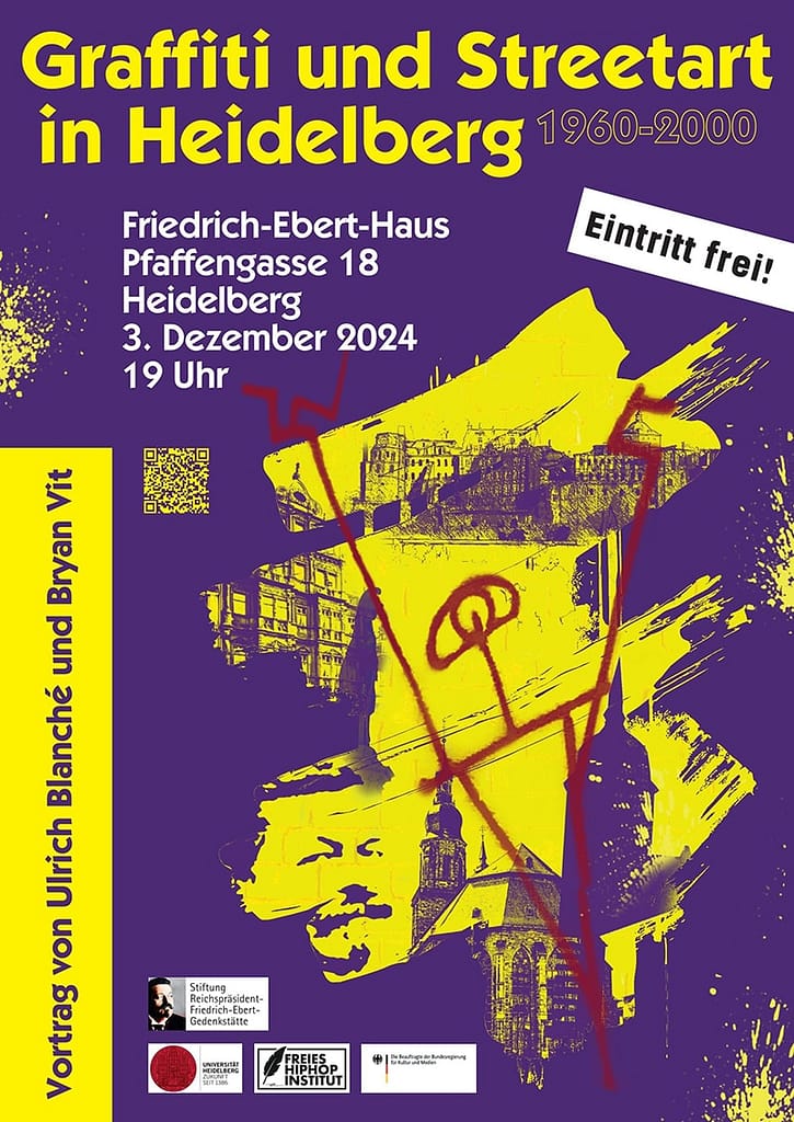 Am 3. Dezember um 19 Uhr sprechen PD Dr. Ulrich Blanché und Bryan Vit im Friedrich-Ebert-Haus über die Geschichte von Streetart und Graffiti in Heidelberg. Seit 2023 ist die Heidelberger Hip-Hop-Kultur immaterielles Kulturerbe ─ und damit auch die Heidelberger Graffitigeschichte. Doch schon seit 1984 und teilweise früher gab es neben Graffiti im Hip-Hop-Kontext auch das, was man heute als Streetart bezeichnen würde: von Spruchgraffiti über den Sprayer von Zürich bis hin zu Schablonengraffiti. Während Ulrich Blanché Streetart in Heidelberg im Spiegel der internationalen Streetartgeschichte beleuchtet, skizziert Bryan Vit, wissenschaftlicher Leiter des Freien Hip-Hop Instituts, anhand von Material aus dem Hip-Hop-Archiv und Zeitzeugenberichten einen sagenumwobenen Moment der frühen lokalen Graffitigeschichte: den ersten besprühten Zug Heidelbergs.