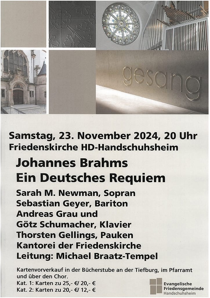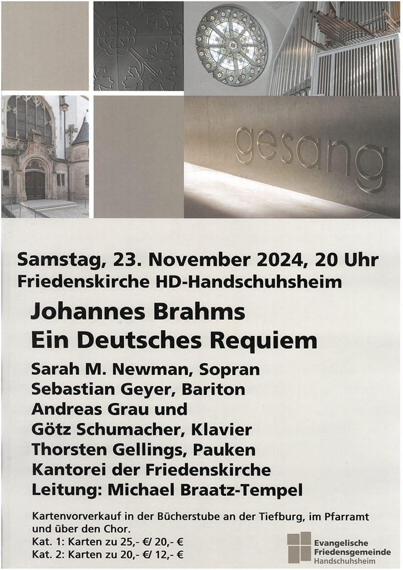 Am Samstag, 23. November wird um 20 Uhr in der Friedenskirche in Heidelberg-Handschuhsheim das „Deutsche Requiem“ von Johannes Brahms aufgeführt. Es erklingt die kammermusikalische „Londoner Fassung“ des Werkes: die Pianisten Andreas Grau und Götz Schumacher begleiten mit der originalen 4-händigen Bearbeitung des Requiems von Johannes Brahms, dazu musiziert Thorsten Gellings (Pauken). Die Vokalsoli werden gesungen von der Sopranistin Sarah M. Newman und dem Bariton Sebastian Geyer. Die Kantorei der Friedenskirche Handschuhsheim singt unter der Leitung von Michael Braatz-Tempel. Das große Werk von Johannes Brahms ist reich an wunderschönen lyrischen und tröstlichen Momenten, es kommen aber auch dramatische, packende und fesselnde Passagen. Durch die selten zu hörende Londoner Fassung wird eine Interpretation mit hoher Textverständlichkeit, Durchsichtigkeit und feinfühliger Artikulation ermöglicht.