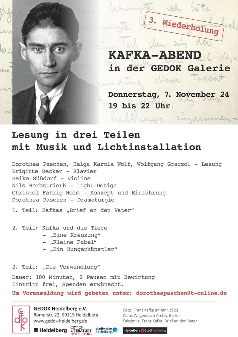 Anlässlich des 100. Todestages von Franz Kafka findet in der GEDOK Galerie ein dreiteiliger Abend mit ausgewählten Texten aus seinen unterschiedlichen Schaffensphasen statt.