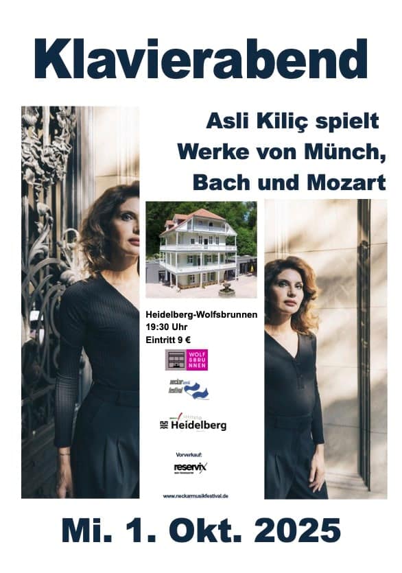 Am Mi. 1. Okt. 2025 gibt um 19:30 Uhr die Pianistin Asli Kilic im Wolfsbrunnen Heidelberg einen Klavierabend. Auf dem Programm stehen die neo-impressionistisch angehauchten, poetischen Märchen und Arabesken op. 32, die klanglich eindringliche Meditation Mediteranée op. 47/1 und die in expressionistischer Kürze verdichteten Bagatellen Op. 60a von Martin Münch, von J.S. Bach die prominente Partita B-Dur BWV 825 und von W. A. Mozart das vielseitige Rondo a-moll KV 511.