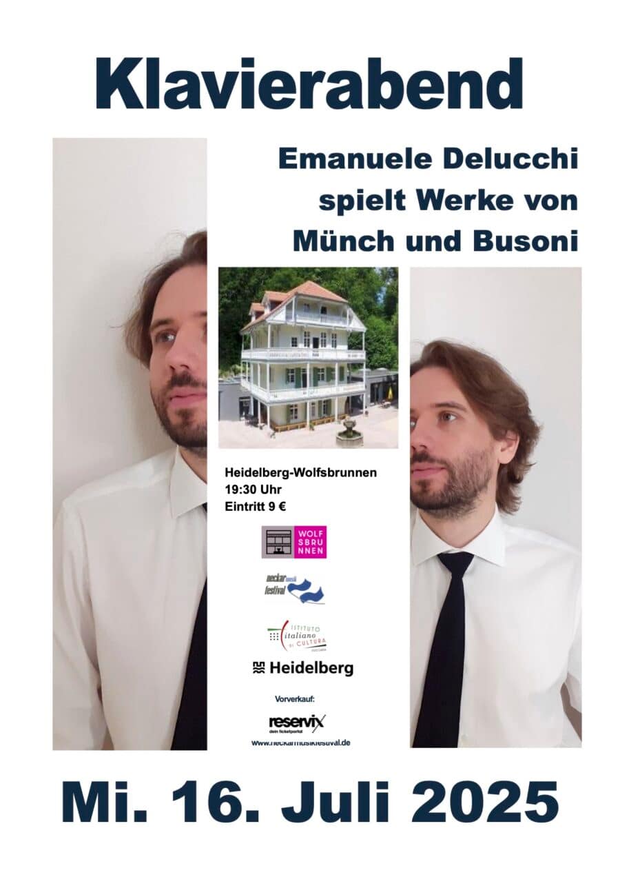 Am Mittwoch, den 16. Juli 2025 gibt der aus Italien stammende Pianist Emanuele Delucchi in Heidelberg Wolfsbrunnen um 19:30 Uhr einen Klavierabend. Auf dem Programm stehen Werke von Martin Münch und Busoni.