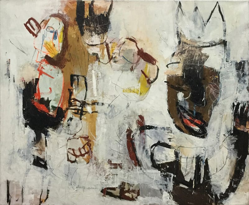 Auch wenn sich die Komplexizität der Bilder im Laufe der Jahre verändert hat, die Farbigkeit mal mehr und mal weniger eine Rolle spielte, Meyers Bilder hatten (und haben) immer einen hohen Wiedererkennungswert. Die Figuration stand von Anfang an im Fokus. Sie hat sich, das kann man sehen, entwickelt. Das entstandene Figurenmaterial ist bis heute die Basis seiner sehr erzählerischen Malerei. Auch der Werke auf Papier, die von Anfang an auf der Methode der Improvisation basierten, einer Arbeitsweise, die häufig auch Skripturales und Zeichnerisches mit einbezieht und die nicht nur für den Künstler selbst, sondern auch für den Betrachter überraschende Ergebnisse hervorbringt. Seine prägnanten Figuren, die Köpfe und Portraits erlauben symbolhaft einen Blick hinter die Kulissen der menschlichen Psyche, sie versuchen das Unmalbare zu benennen. Und sie tun das häufig mit Humor.