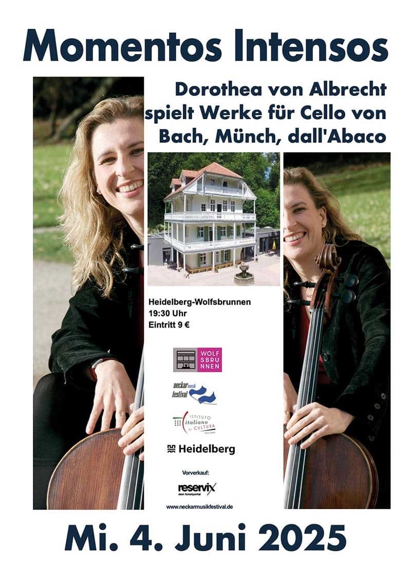 Am Mi. 4. Juni spielt die Cellistin Dorothea von Albrecht in Heidelberg Wolfsbrunnen um 19:30 Uhr Werke für Cello solo von dem Barock-Komponisten J. C. dall`Abaco, von J. S. Bach und Martin Münch.