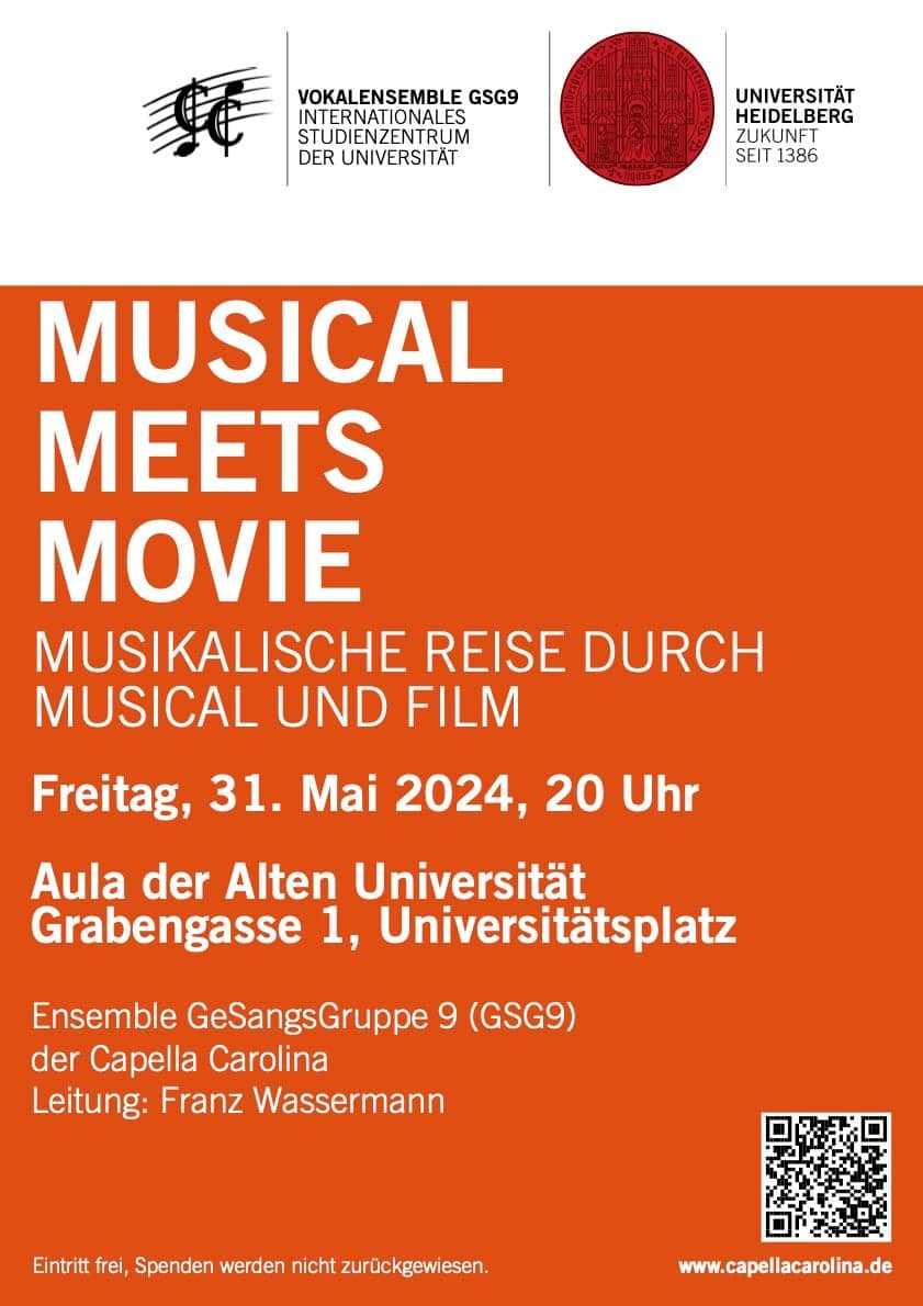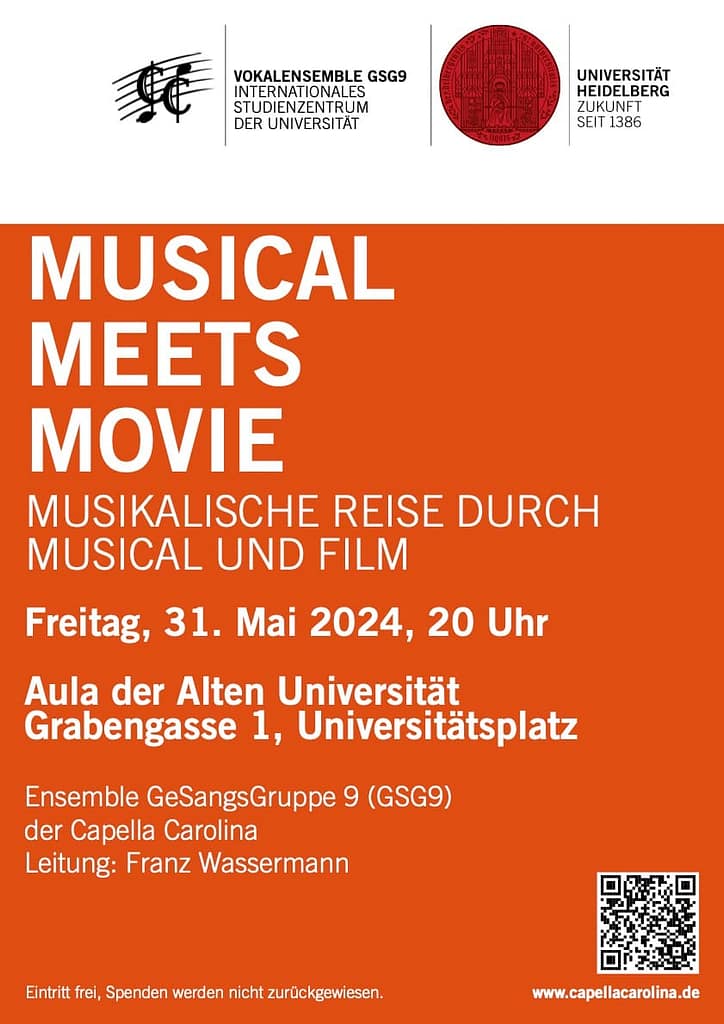 Unter dem Titel “Musical meets Movie” präsentiert das Ensemble GeSangsGruppe 9 (GSG9) der Capella Carolina sein diesjähriges Programm am Freitag, 31. Mai 2024, 20 Uhr, in der Aula der Alten Universität, Heidelberg, Universitätsplatz. Beliebte Stücke aus Musicals und Filmen gibt es da zu hören: wir stellen My Fair Lady vor und auch den Tanz der Vampire, ein Medley aus „Joseph and the Technicolor Dreamcoat” von Andrew Lloyd Webber, dazuhin brandneu “Var hör vi hemma” aus dem Musical “Kristina från Duvemåla”. Benny Andersson von ABBA hat es geschrieben; in diesem Jahr wurde es erstmals in Deutschland aufgeführt.