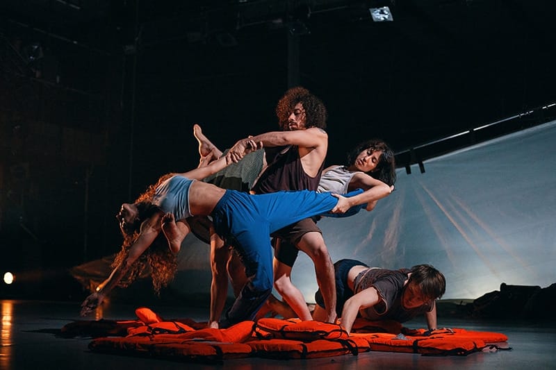 HURyCAN, haben eine der prägnantesten Handschriften innerhalb des zeitgenössischen Tanzes entwickelt, indem sie die Möglichkeiten der Contact Improvisation zu höchster Vollendung treiben und mit Akrobatik verbinden. Virtuos und voller Überraschungen sind ihre Stücke, humorvoll und gleichzeitig von großer Menschlichkeit.Ihr Stück salVa handelt von Geflüchteten auf einem Boot. Sie tragen leuchtend orangene Rettungswesten und ebenso tragen sie ihre Würde, Identität und ein Stück Heimat fest umgeschnallt in ihrem Gepäck. Es ist eine tragische und schicksalhafte Reise, die HURyCAN zum Ausgangspunkt für ihre tänzerische Erkundung nehmen. Bewegung wird hier zum Mittel der Kommunikation und zum Ausloten von Grenzen. Dabei geht es um die körperliche wie um die sinnliche Erfahrung von arglosen, aber auch grenzüberschreitenden Handlungen.