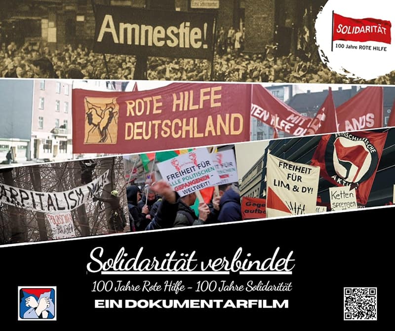 Zum 100-jährigen Bestehen der Roten Hilfe ist der Film „Solidarität verbindet — 100 Jahre Rote Hilfe“ erschienen, der sich der Geschichte und Gegenwart der Solidaritätsarbeit widmet.Beginnend bei der Roten Hilfe Deutschlands in der Weimarer Republik und in der Illegalität während des NS-Faschismus, schlägt der Film einen Bogen über die Neugründung von Rote-Hilfe-Strukturen in den frühen 1970er-Jahren bis zur heutigen Roten Hilfe e. V.