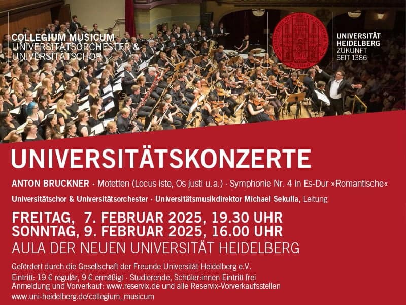 Motetten von Anton Bruckner, darunter „Locus iste“ und „Os justi“, sowie seine Symphonie Nr. 4 in Es-Dur „Romantische“ stehen auf dem Programm des Universitätskonzerts im Wintersemester. Dazu lädt das Collegium Musicum – der Universitätschor und das Universitätsorchester – der Universität Heidelberg ein. Für Studierende und Schüler:innen sowie für Auszubildende ist der Eintritt frei.