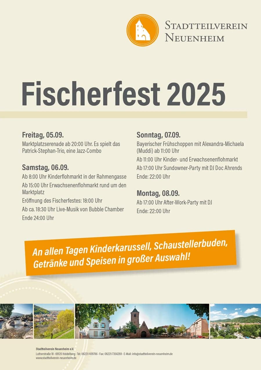 Heute beginnt das traditionsreiche Neuenheimer Fischerfest und verwandelt den Neuenheimer Marktplatz in ein buntes Treffpunkt für Groß und Klein. Besucherinnen und Besucher dürfen sich auf ein vielfältiges Programm freuen. Ein großer Flohmarkt lädt zum Stöbern ein und bietet die Gelegenheit, kleine und große Schätze zu entdecken. Für die jüngsten Gäste dreht sich das Kinderkarussell und sorgt für fröhliche Momente.