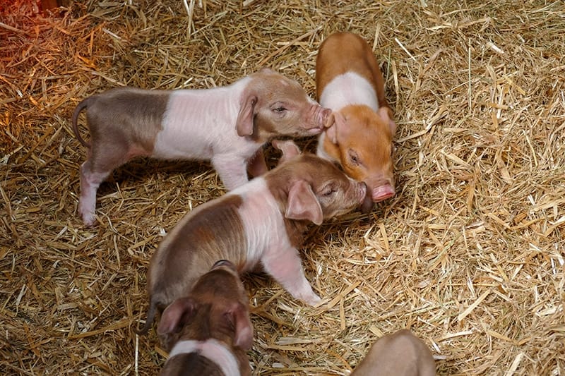 Buntgemustert sind die kleinen Ferkel, die seit ein paar Tagen auf der Welt sind und ihre Mütter auf Trapp halten. Die auffallend zweifarbige Zeichnung ist typisch für diese Schweinerasse. Das Rotbunte Husumer-Schwein ist auch als Dänisches Protestschwein bekannt. Die Schweine wurden Ende des 19. Jahrhunderts speziell mit dieser Färbung gezüchtet, da die dänische Minderheit in Schleswig-Holstein nicht selbst ihre Flagge zeigen durfte. So wurden kurzerhand die zweifarbigen Tiere als „lebende Flaggen“ in den Vorgärten gehalten.